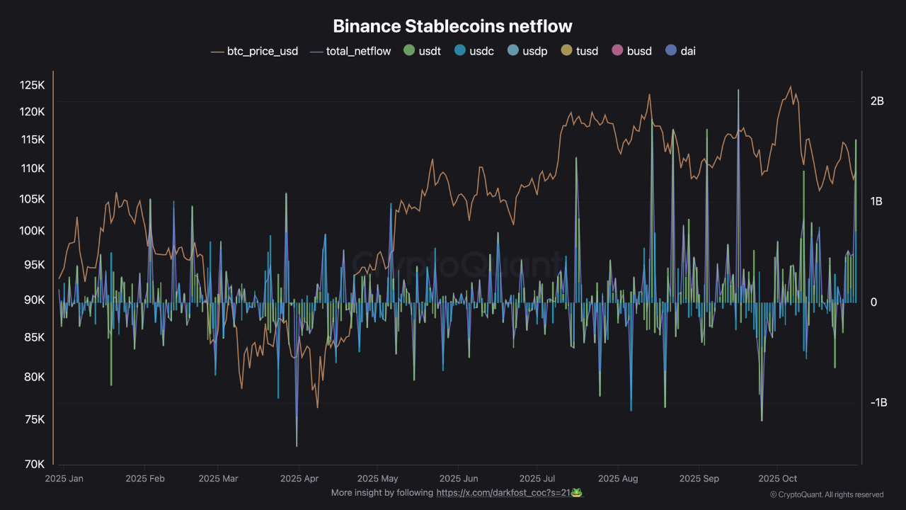 Fresh data from CryptoQuant, shared by analyst Darkfost, revealed that Binance recorded $1.6 billion in net stablecoin inflows on October 31, marking one of the largest single-day liquidity injections of 2025.