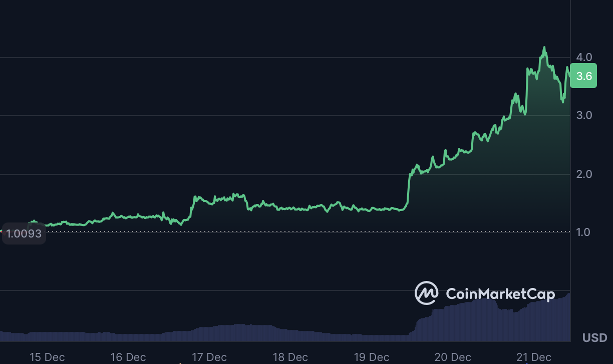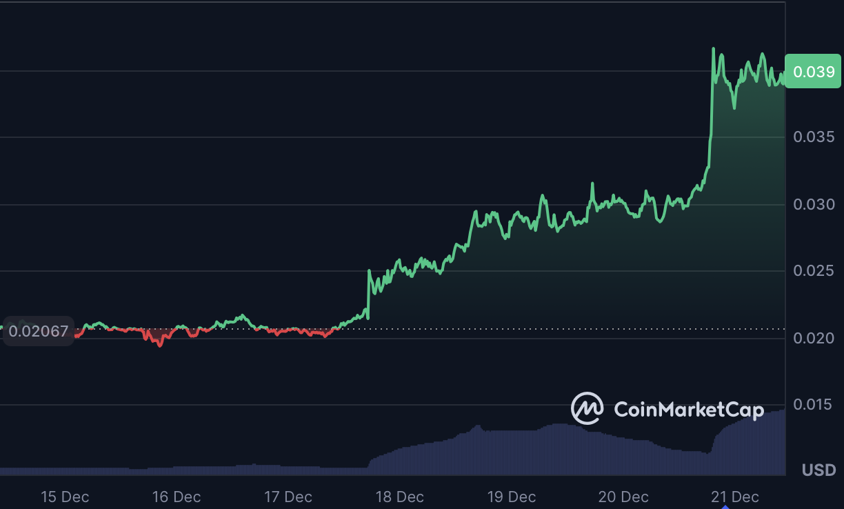 The rally aligns with renewed rotation into AI-themed assets and high-beta memecoins, though risk remains elevated. The RSI near 71 signals stretched conditions, and despite the recent surge, the token remains down 88% on a 365-day basis.