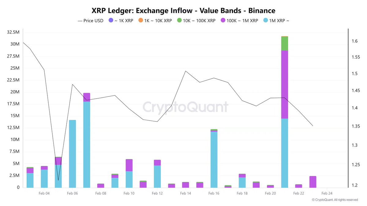 More than 31.75 million XRP flowed into Binance in a single day, marking one of the largest recent exchange inflow spikes for the asset.