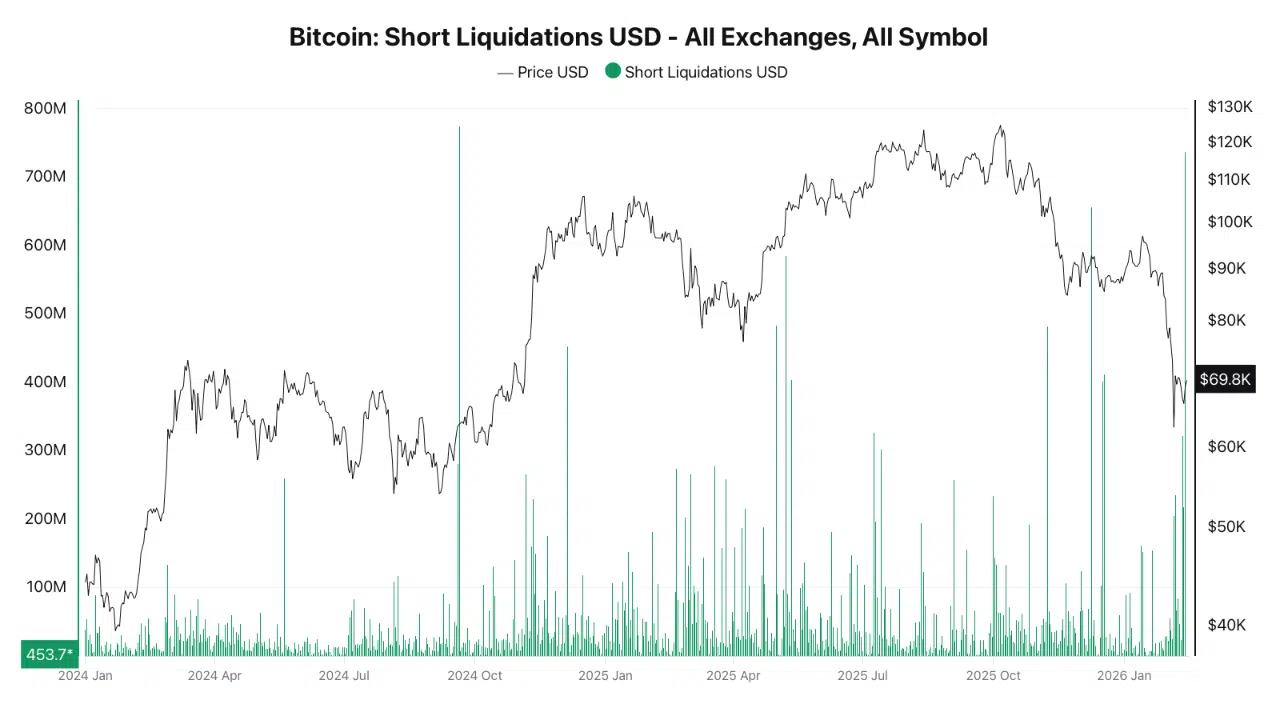 According to data shared by CryptoQuant, approximately $736 million in short positions were liquidated in a single session, the largest short wipeout since September 20, 2024, when daily liquidations reached $773 million.