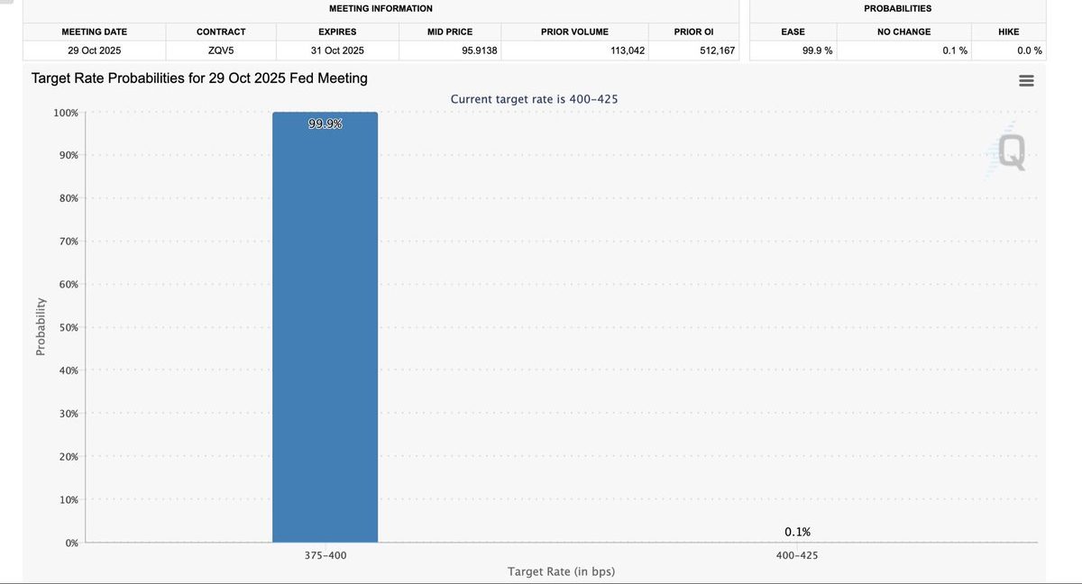 The Federal Reserve is widely expected to cut interest rates by 25 basis points at today’s FOMC meeting, a move that futures markets have already fully priced in. According to CME’s FedWatch Tool, traders assign a 99.9% probability to the target range being lowered from 4.00–4.25% to 3.75–4.00%, marking the central bank’s second rate cut of 2025.