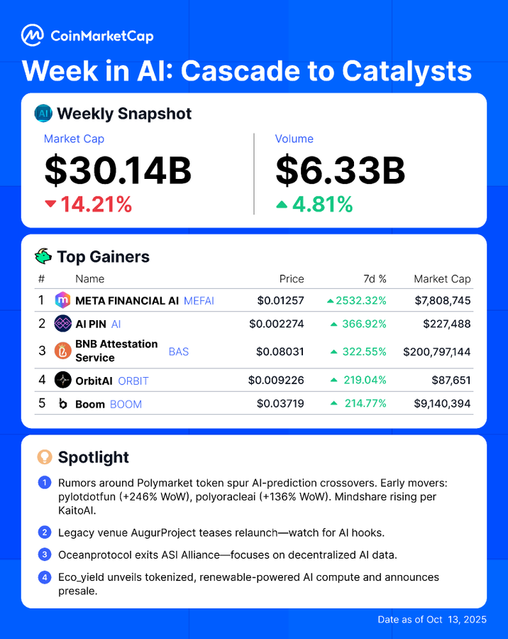 According to CoinMarketCap’s latest Week in AI: Cascade to Catalysts report, the total AI market cap fell 14.21% to $30.14 billion, while volume jumped 4.81% to $6.33 billion, signaling active repositioning among investors.
