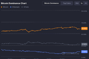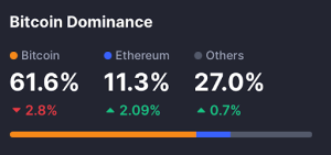 A notable shift is unfolding across the crypto landscape as Bitcoin’s dominance steadily declines, dropping to 61.6% – a 2.8% decrease – while Ethereum has climbed to 11.3% and other altcoins now make up 27% of the market.