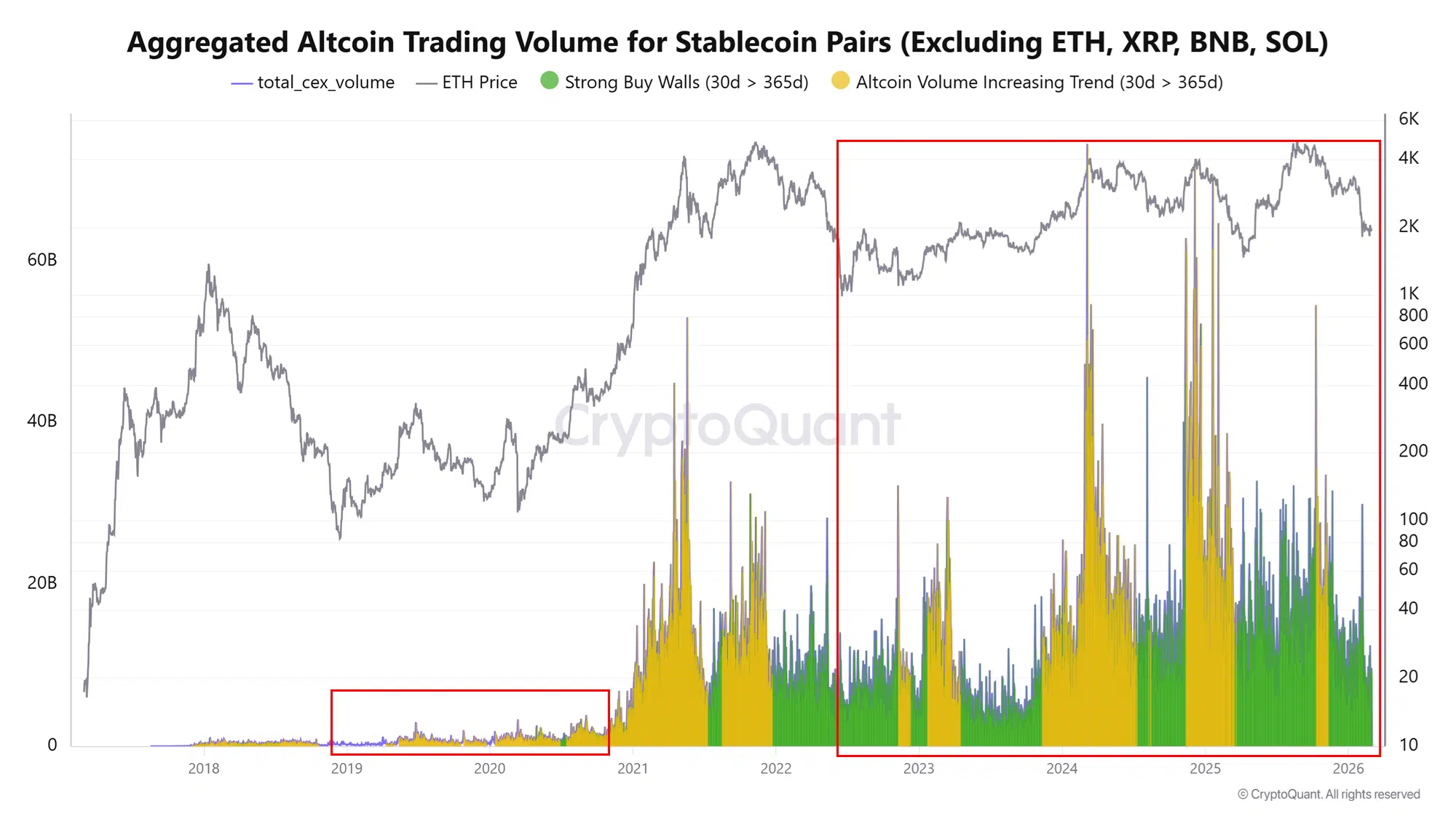 The CryptoQuant chart covers 2018 through early 2026 and tracks two things simultaneously: total CEX volume for altcoin-stablecoin pairs in the left axis (billions), and the ETH price in the right axis as a market cycle reference.