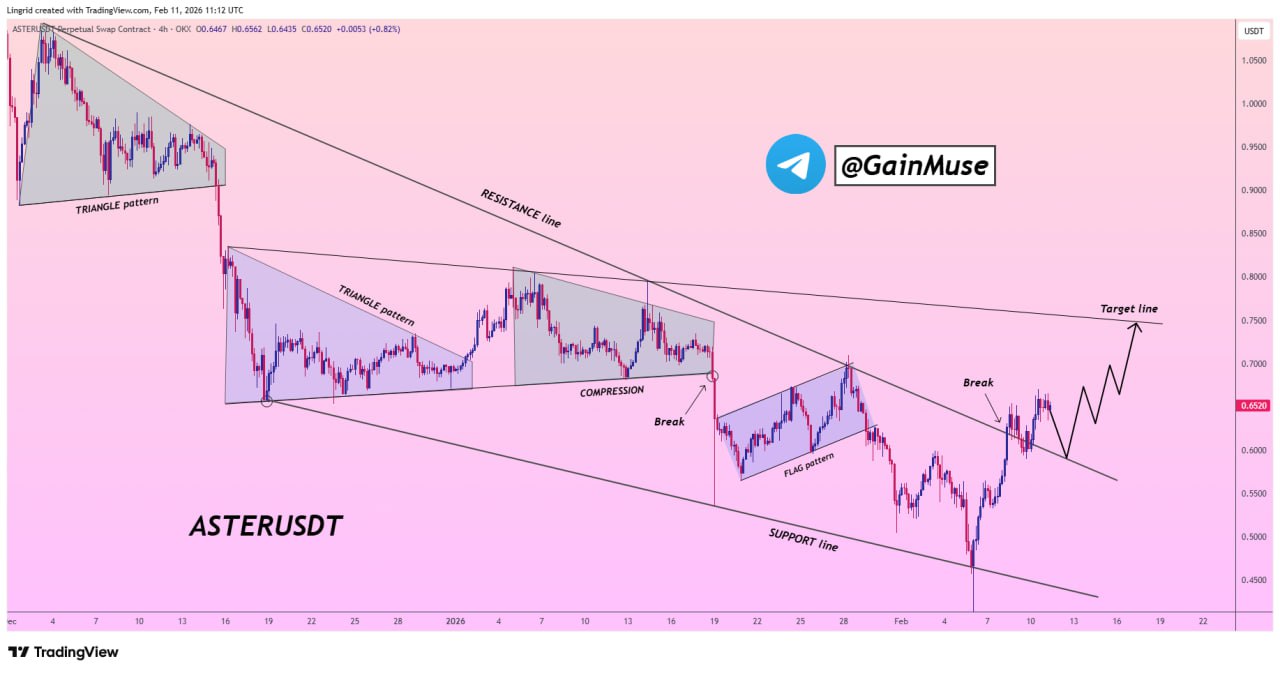 As long as Aster holds above $0.650, the breakout structure remains intact. A sustained move above $0.700 would open the path toward the upper descending resistance drawn in GainMuse’s chart, which visually aligns near the $0.75 – $0.80region.