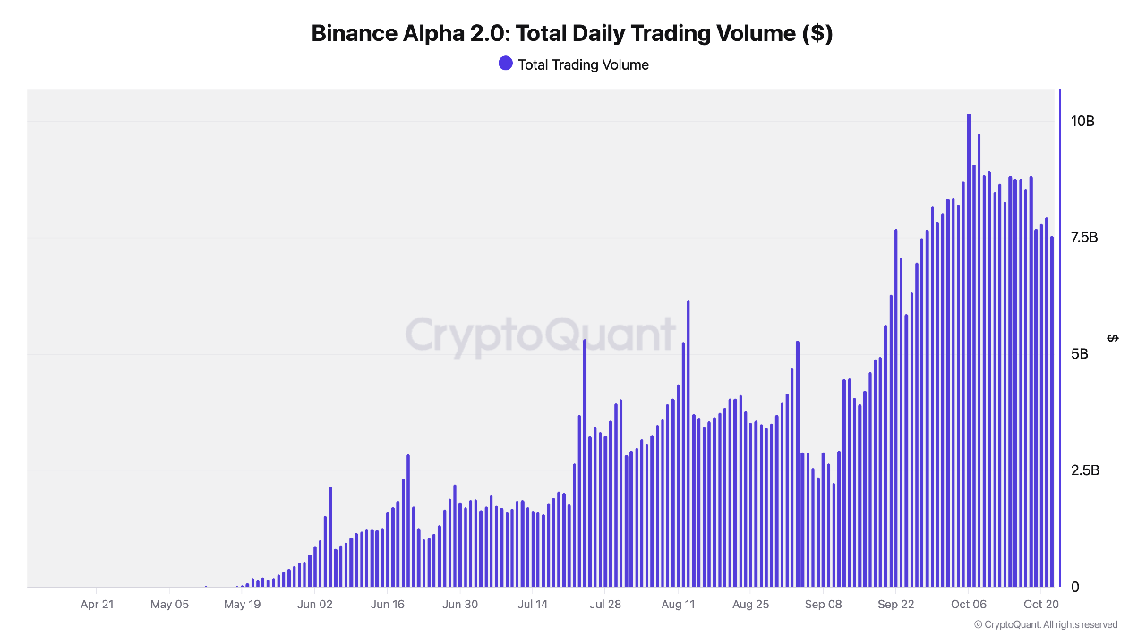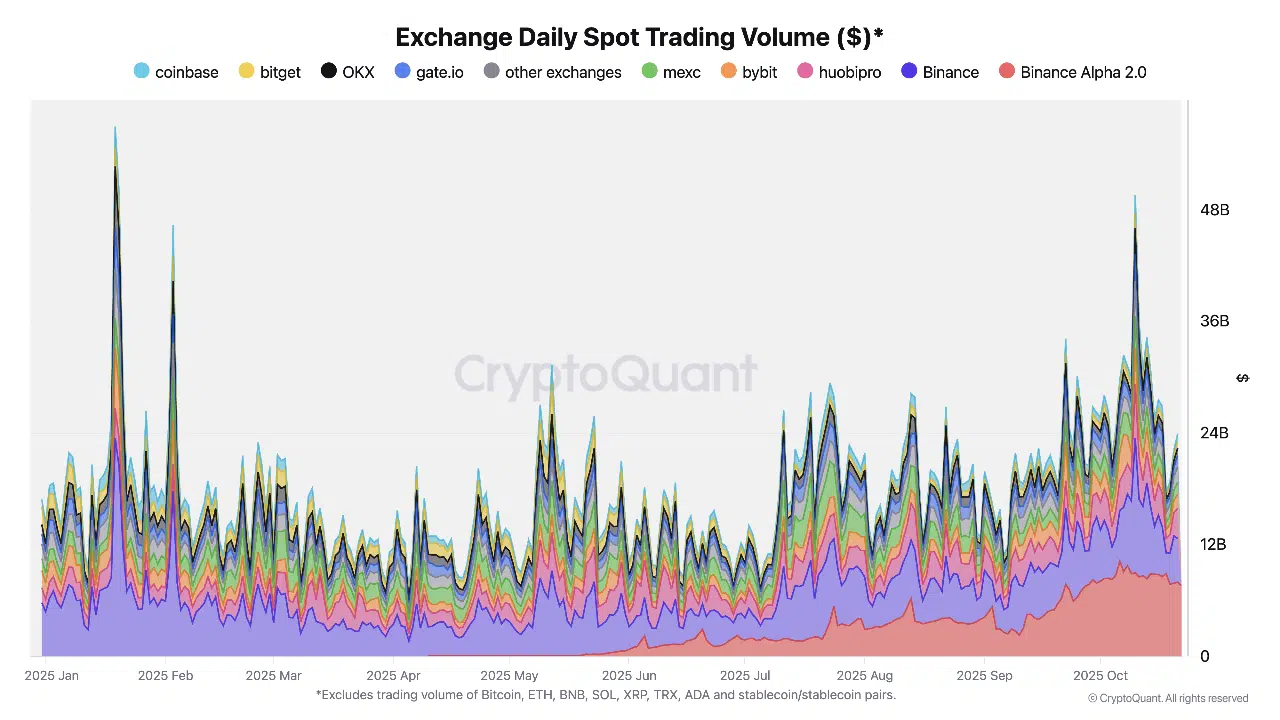 According to the latest report from CryptoQuant, Binance’s Alpha 2.0 platform has rapidly become a dominant force in the early-stage token trading landscape, surpassing the daily spot volumes of nearly all centralized exchanges except Binance itself.