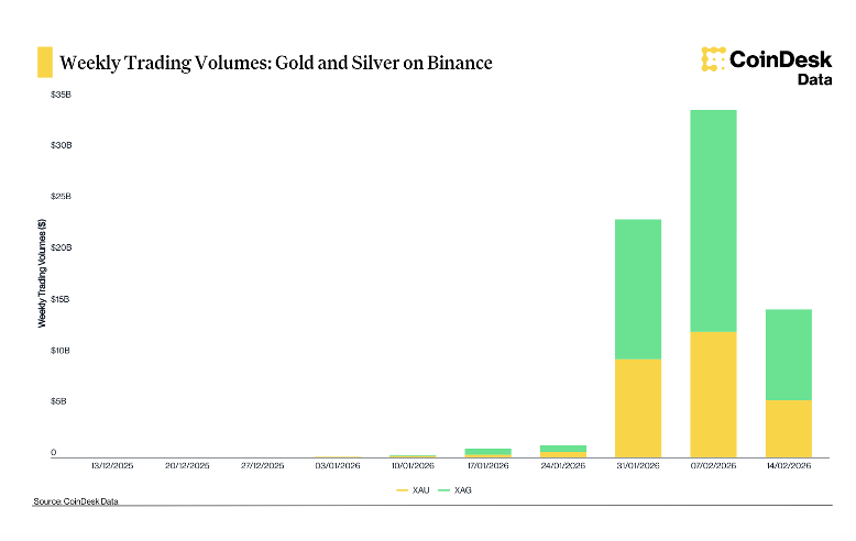 The CoinDesk Data chart tells the story more precisely than any summary could. Weekly trading volumes for gold and silver on Binance were effectively zero as recently as mid-December 2025. By the week of January 31st, combined weekly volume had climbed past $20 billion. The following week, February 7th, it peaked above $32 billion. The numbers didn’t gradually build. They appeared, almost immediately, at scale.