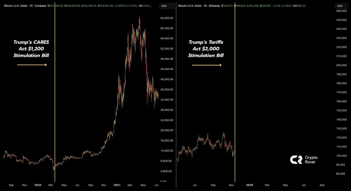 - Crypto Rover draws parallels between the 2020 CARES Act rally and today’s Trump Tariffs $2,000 Stimulus Bill, suggesting a familiar setup for the next major price cycle.