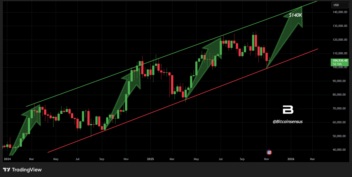 Analyst platform Bitcoinsensus reports that Bitcoin is maintaining its position within a long-term ascending parallel channel, a structure that has guided price action since early 2024. The chart’s upper boundary projects a potential retest near $140,000 if the channel remains intact in the coming months.