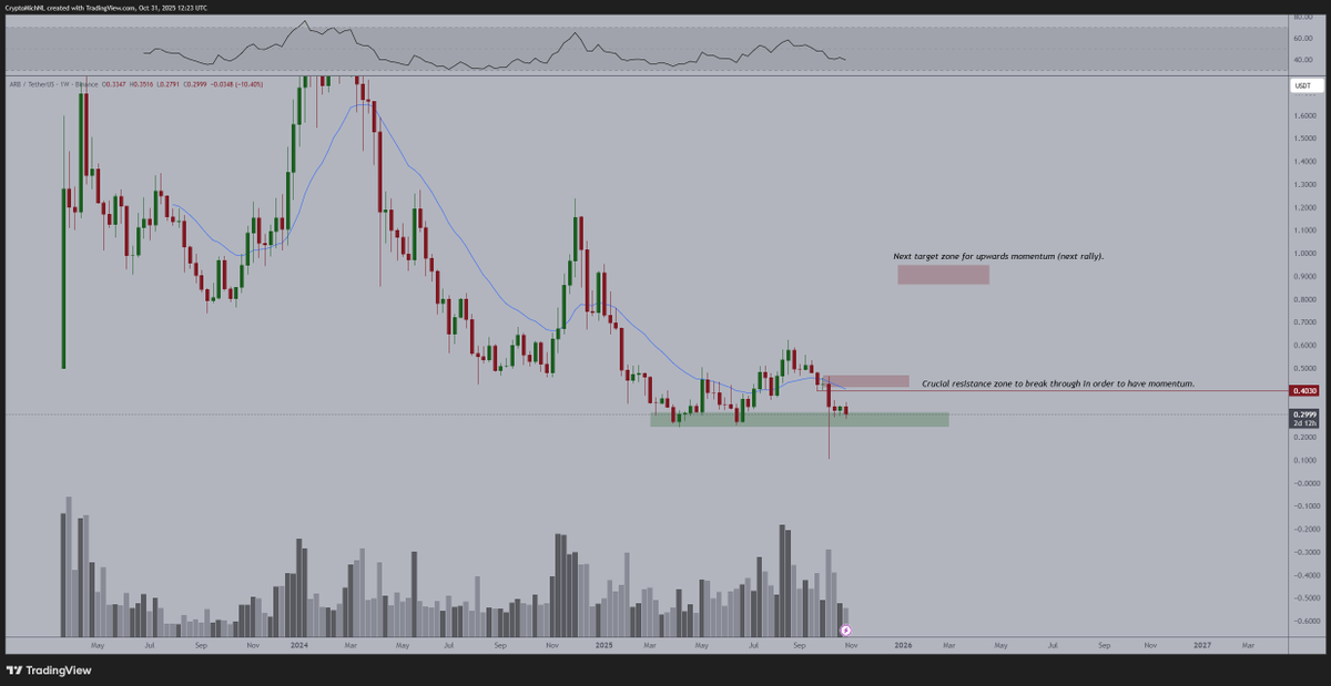He identified Arbitrum (ARB) as a key opportunity within that ecosystem, noting that the token is at a cycle low while forming bullish divergences against Bitcoin.