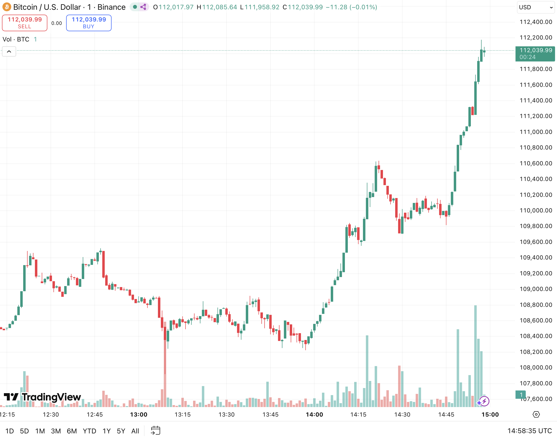 Bitcoin (BTC) surged back above $112,000 on Tuesday, marking a sharp rebound from last week’s mid-range consolidation. According to data from TradingView and CoinMarketCap, the world’s largest cryptocurrency is now trading at $112,040, up 0.66% in the past 24 hours, with daily trading volumes soaring nearly 20% to $68.9 billion.