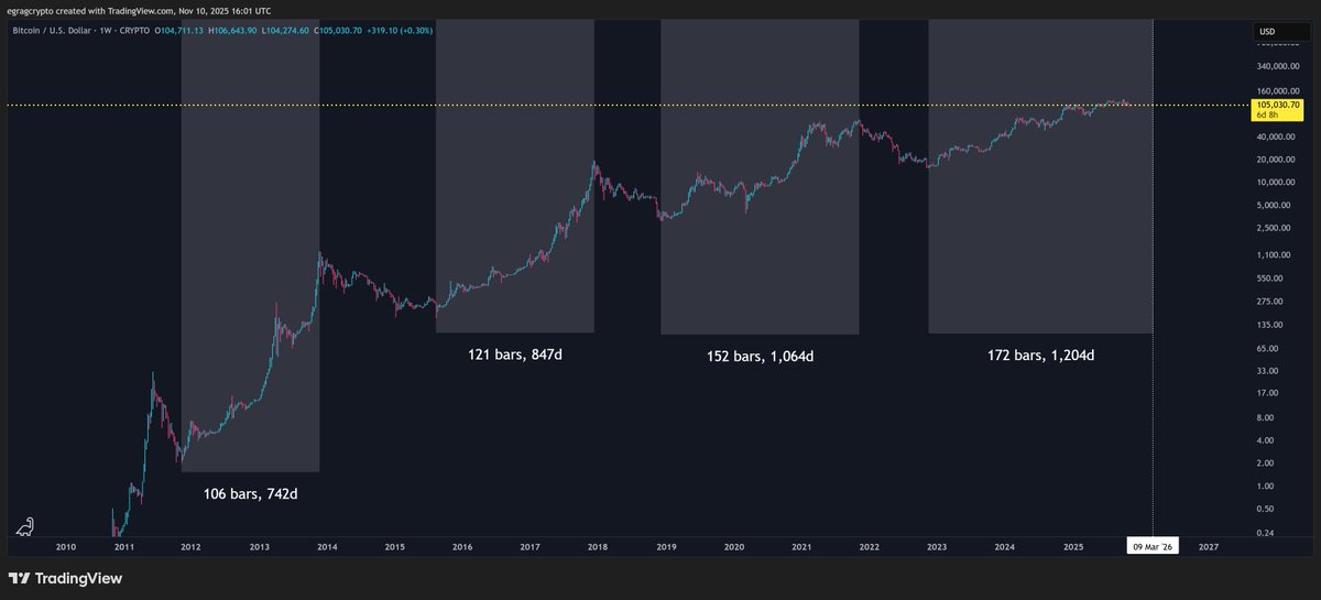 Bitcoin’s previous bull market cycles, starting from 2011, have shown a steady pattern of time extensions: