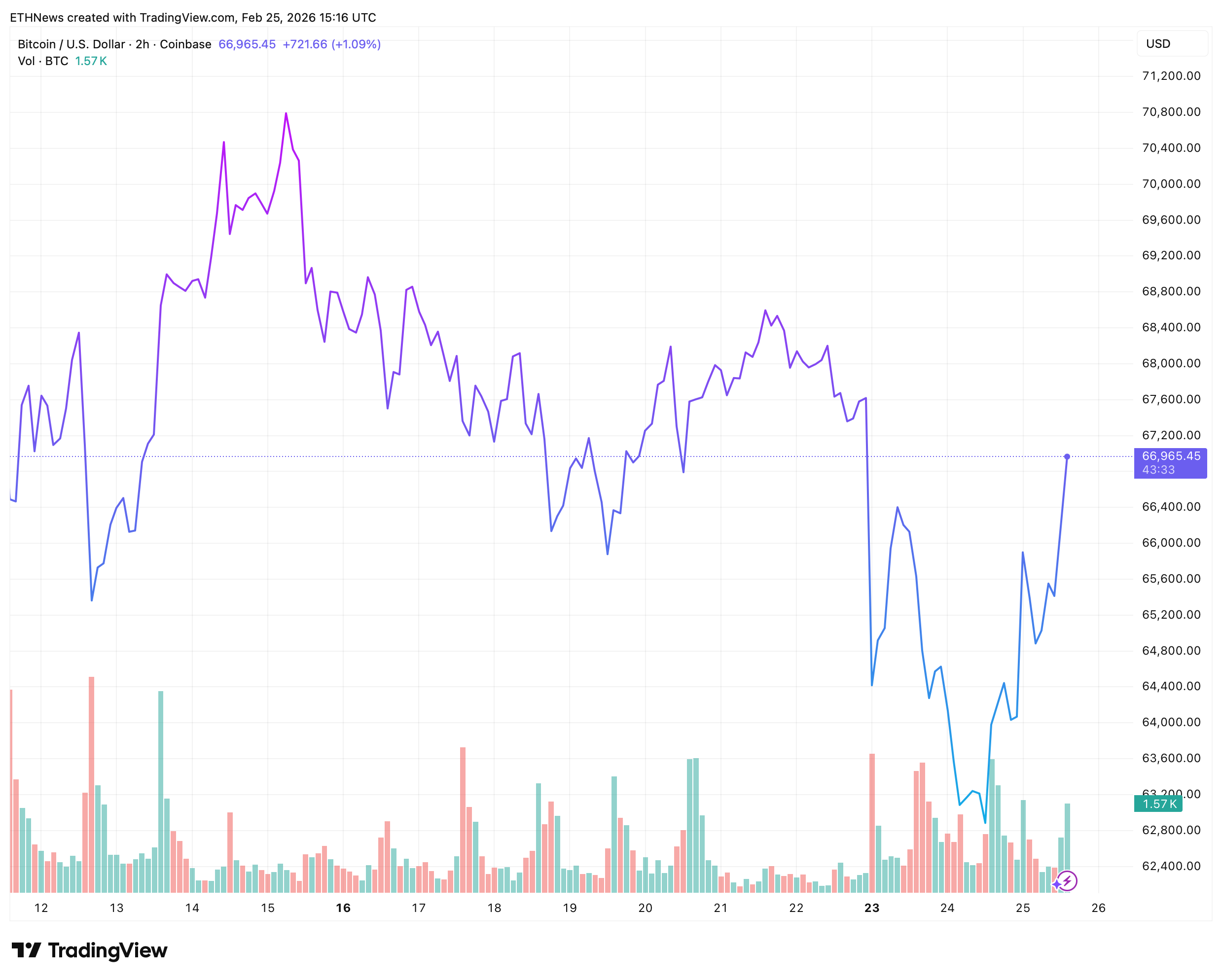 Bitcoin is currently trading around $66,965, holding the $65,000–$66,000 support zone after sweeping local lows near $62,800–$63,200. The reaction from that area has been sharp, but structure remains compressed beneath descending resistance.