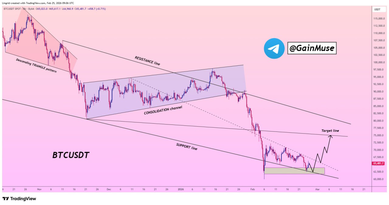 GainMuse’s framework highlights the importance of the highlighted support box. As long as price holds above $65,000, the base remains technically valid.