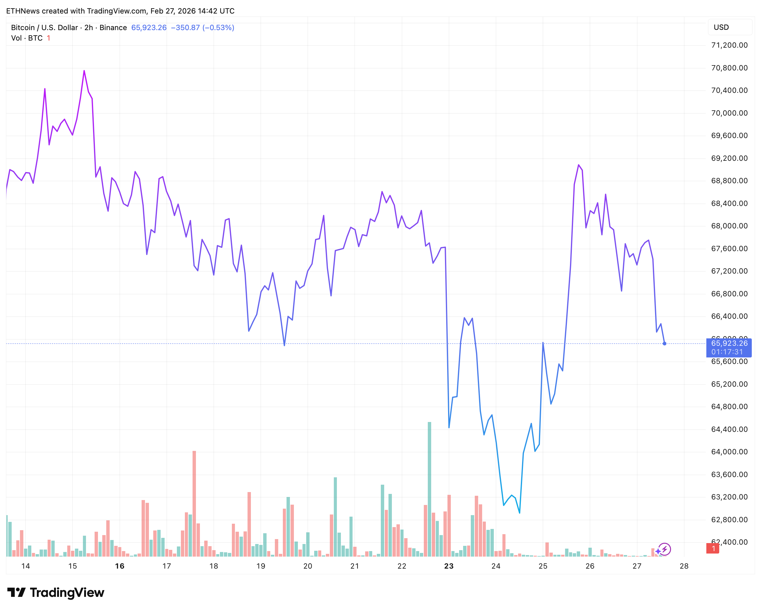 The 2-hour chart covering the past two weeks shows a market that went through something significant around February 22–23, a sharp flush from the $66,400 area all the way down to roughly $63,000, accompanied by the heaviest volume bars visible across the entire chart window.