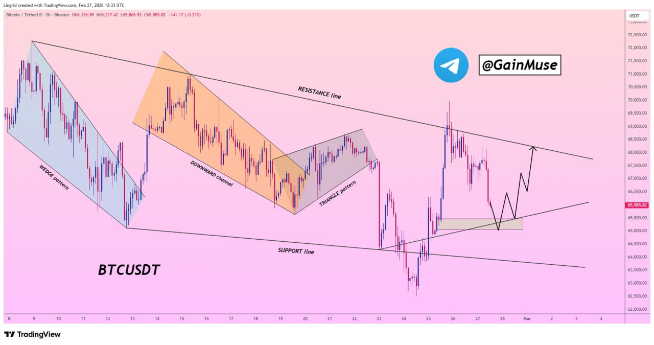 The trader flagged two scenarios explicitly. Sustained strength above the ascending trendline, in GainMuse’s view, could fuel continuation toward the overhead resistance zone sitting between $68,400 and $69,200. The invalidation level is equally clear: a breakdown beneath the higher low area, roughly the $64,800–$65,000 zone, would undermine the bullish continuation thesis and likely invite a retest of the February 23 lows near $63,000.