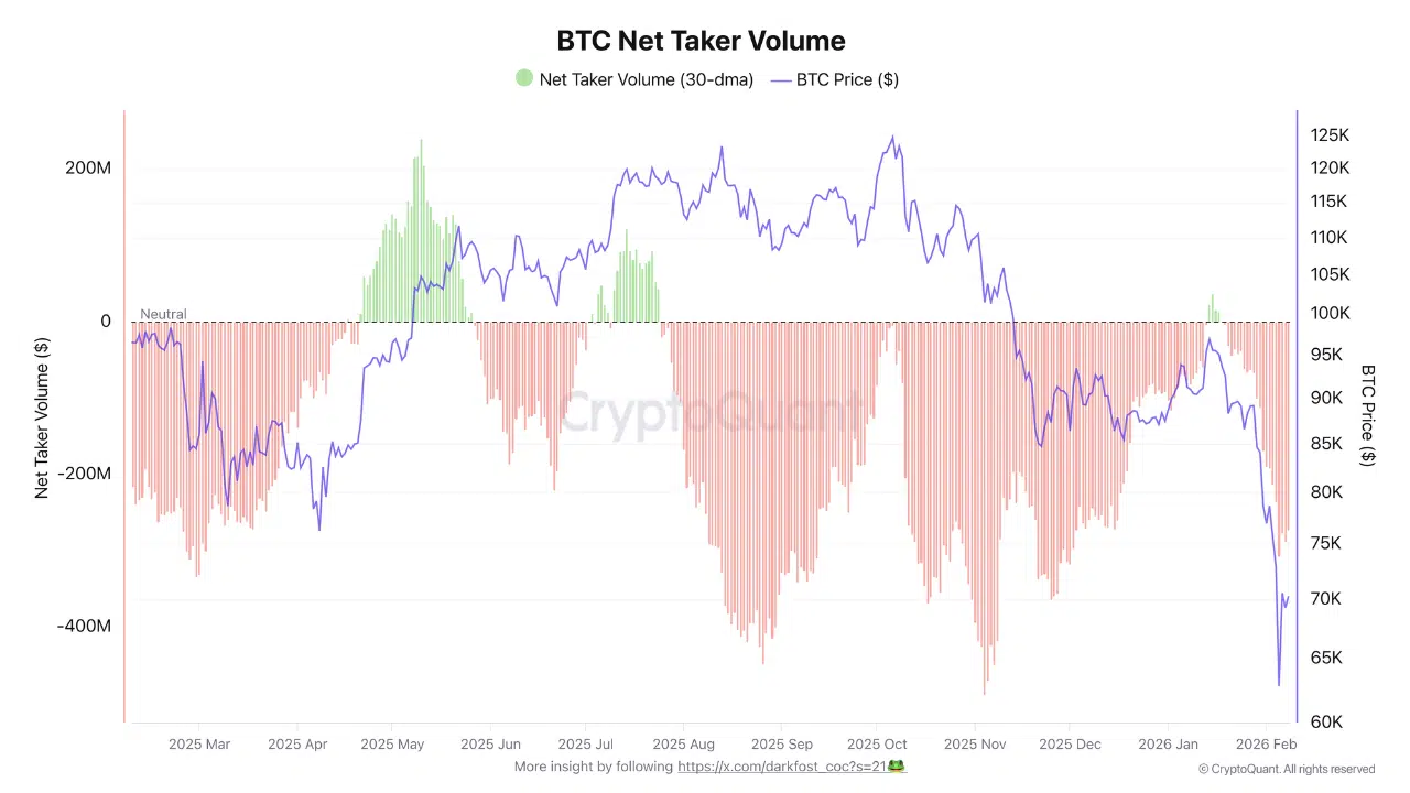 Between November and January, the chart shows a brief stabilization phase. During this period, buyers temporarily regained some control, with Net Taker Volume improving to around +$36 million. This coincided with reduced volatility and a short-lived price recovery.