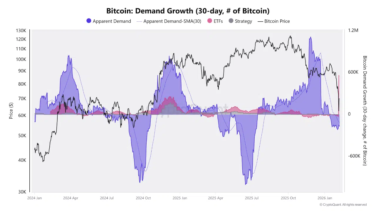 In contrast to holder accumulation, demand-side indicators have weakened significantly. Apparent Demand on a 30-day basis surged during the most recent impulsive rally but has since reversed sharply into negative territory. The depth of this reversal points to a meaningful slowdown in spot absorption, suggesting that recent inflows lacked the persistence required to sustain upward price momentum.