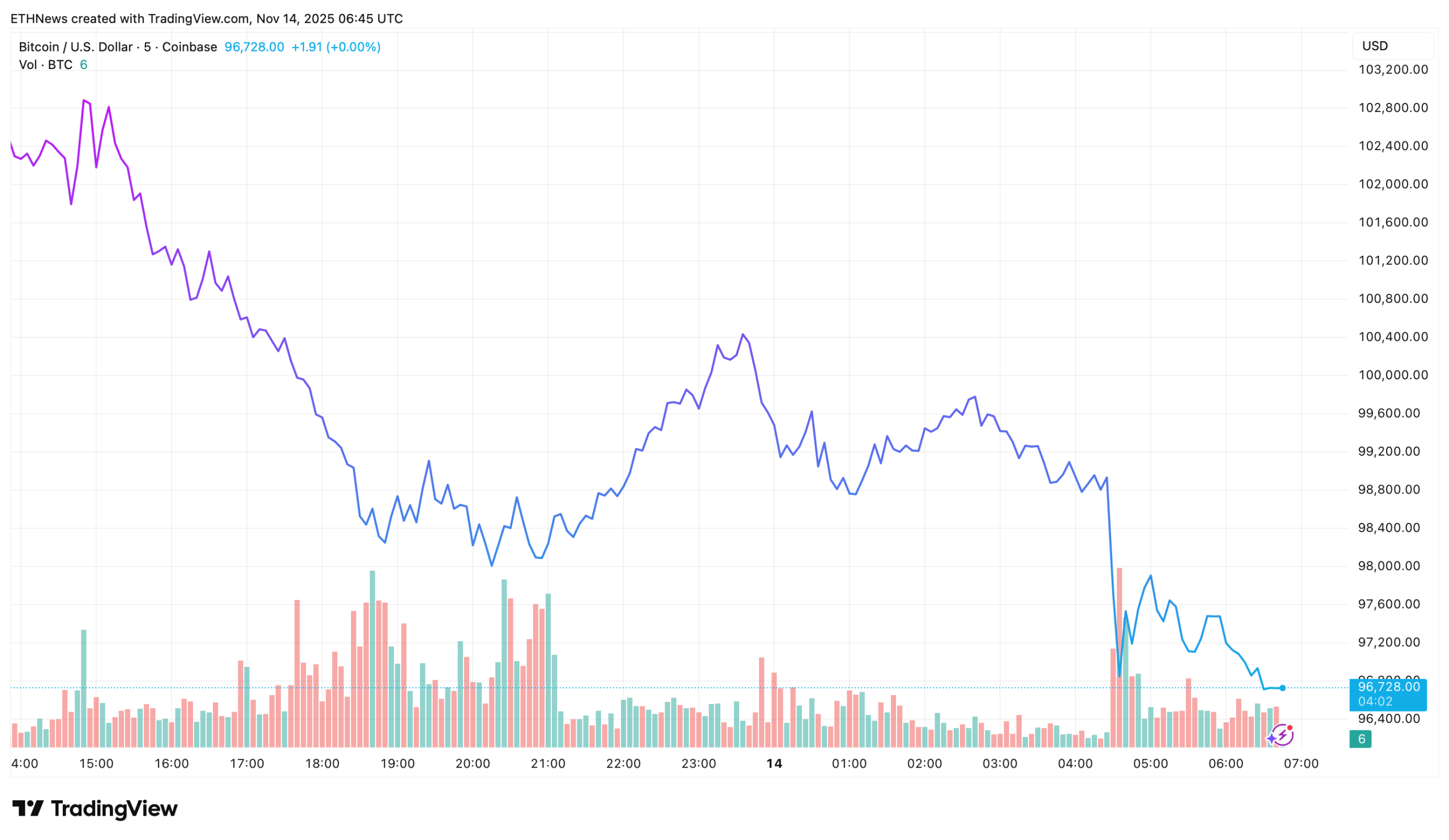 Bitcoin has fallen to $96,770, extending its 24-hour decline to 6.45% as long-term holders (LTHs) unleash one of the largest selling waves of the year. The market cap has slid to $1.93 trillion, while trading volume surged more than 45%, signaling heavy distribution and widespread liquidations. The TradingView chart shows a persistent downtrend from the $103K region, followed by a steep breakdown below earlier support levels.