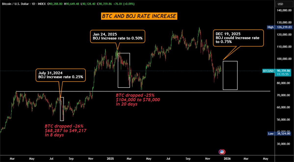 The chart flags December 18–19 as the next BOJ decision window, where rates could rise again, potentially to 0.75%. If that occurs, the analysis suggests markets could face another fast-moving sell-off.