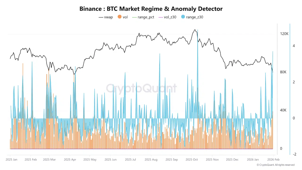 However, standardized volatility indicators tell a different story. The vol_z30 metric has climbed to roughly +2.69, while range_z30 has reached approximately +3.72. These readings indicate that both trading volume and intraday price range are significantly elevated relative to their 30-day averages when adjusted for standard deviation.