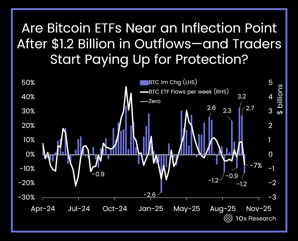 Bitcoin’s recent downturn has triggered one of the largest ETF outflows of 2025, with $1.2 billion exiting crypto funds over the past week, according to the latest 10x Research “Weekly Crypto Kickoff.” The sharp reversal follows a strong October, when Bitcoin ETFs had attracted $3.7 billion in inflows, marking a dramatic shift in sentiment as volatility surged and traders rushed to hedge positions.