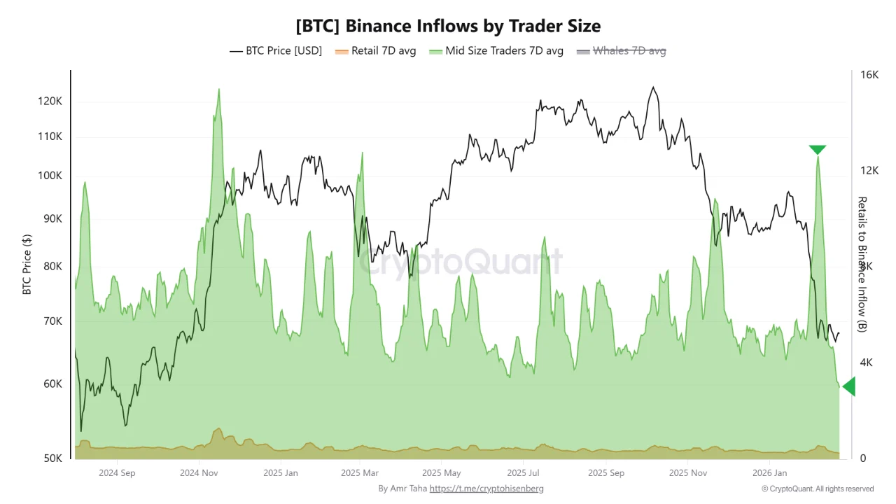Bitcoin exchange flow data show a structural change that stands out. While BTC continues to trade sideways above $66,000, inflows from mid-size traders on Binance have collapsed to levels not seen since 2017, according to data shared by CryptoQuant.