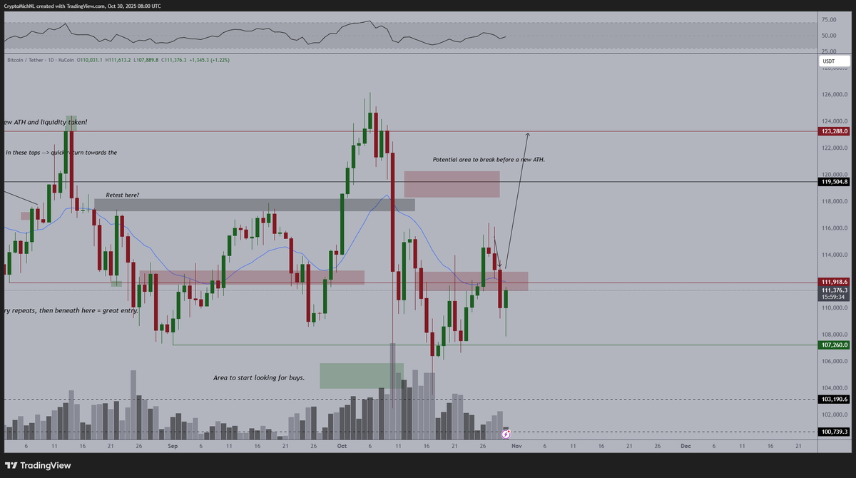 Van de Poppe noted that Bitcoin’s failure to hold above $112,000 does not invalidate the broader uptrend structure. He reaffirmed that his “dip and higher-low” thesis remains intact and expects the next bullish impulse once BTC breaks back above the $112K resistance zone.