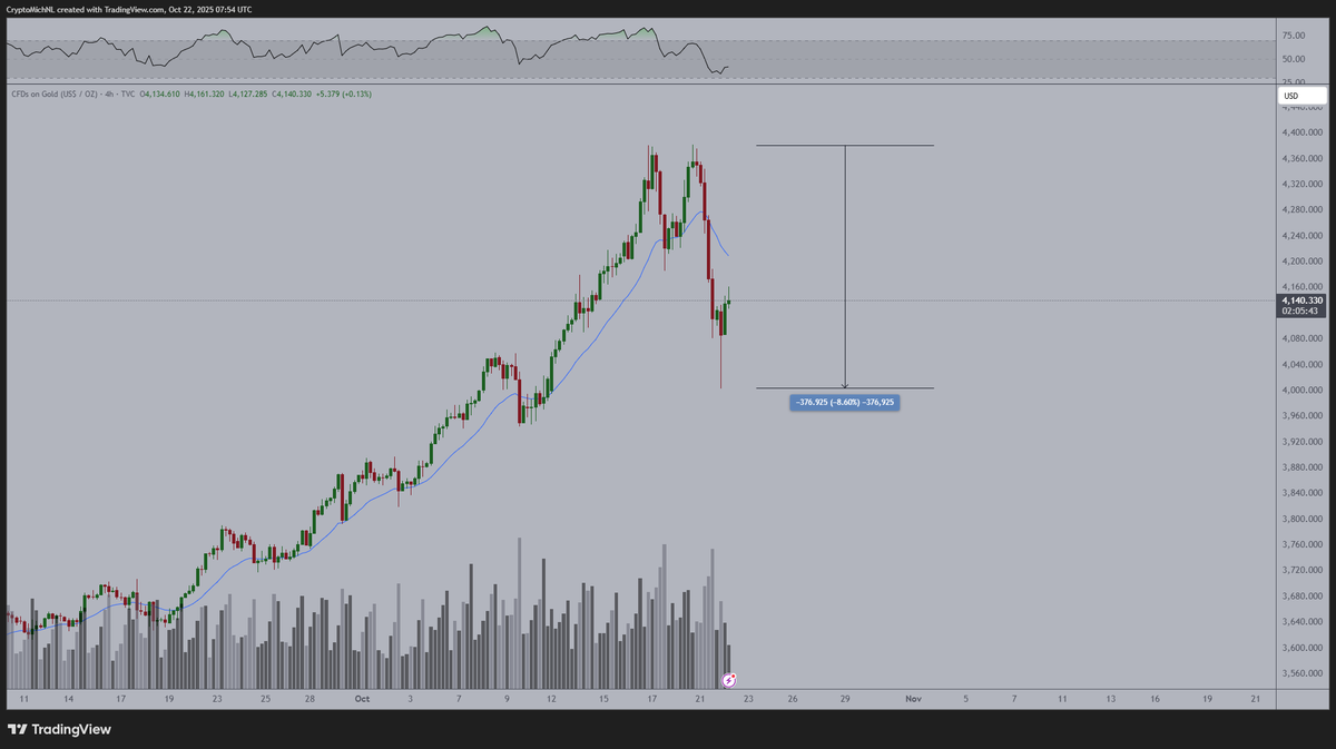 Adding a macro perspective, Michaël van de Poppe pointed to a dramatic 8% plunge in gold, describing it as an extreme and unsustainable outlier.