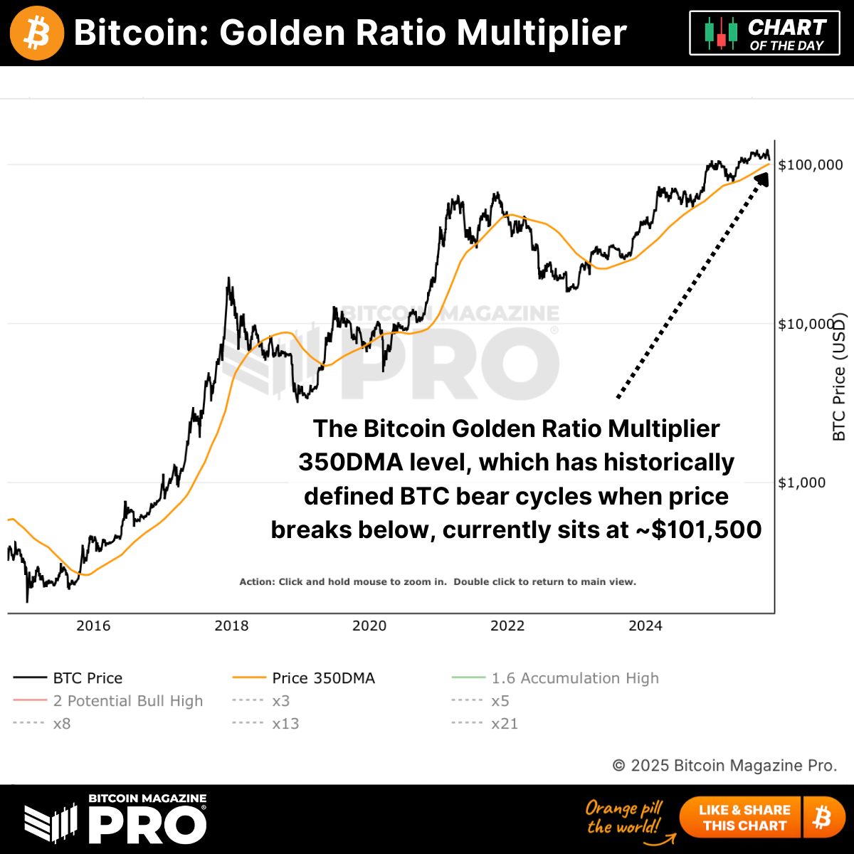 Analysts are closely watching the Golden Ratio Multiplier’s 350-day moving average (DMA), a long-term indicator that has historically separated bull and bear phases. According to Bitcoin Magazine Pro, the multiplier currently sits near $101,500 and is climbing steadily each day, a level that, if retested or broken, could confirm a new expansion phase for BTC.