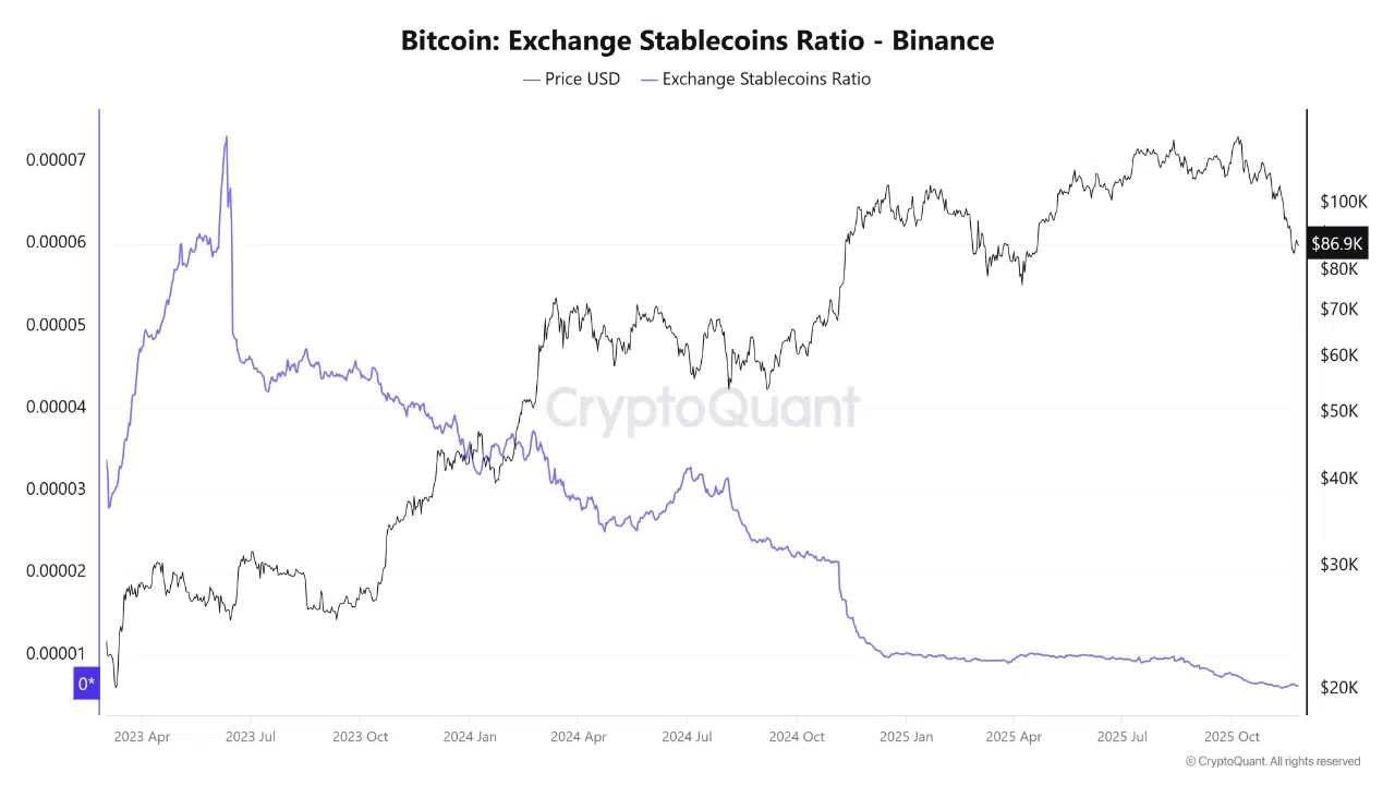 According to a new market update shared by CryptoQuant, Bitcoin is entering a period of severe liquidity weakness as the Exchange Stablecoins Ratio on Binance drops to its lowest level in history. The chart shows a continuous decline in stablecoin reserves relative to Bitcoin over the past two years, with the ratio collapsing to fresh lows precisely as BTC retreated from the $100K region toward the high-$80K zone.
