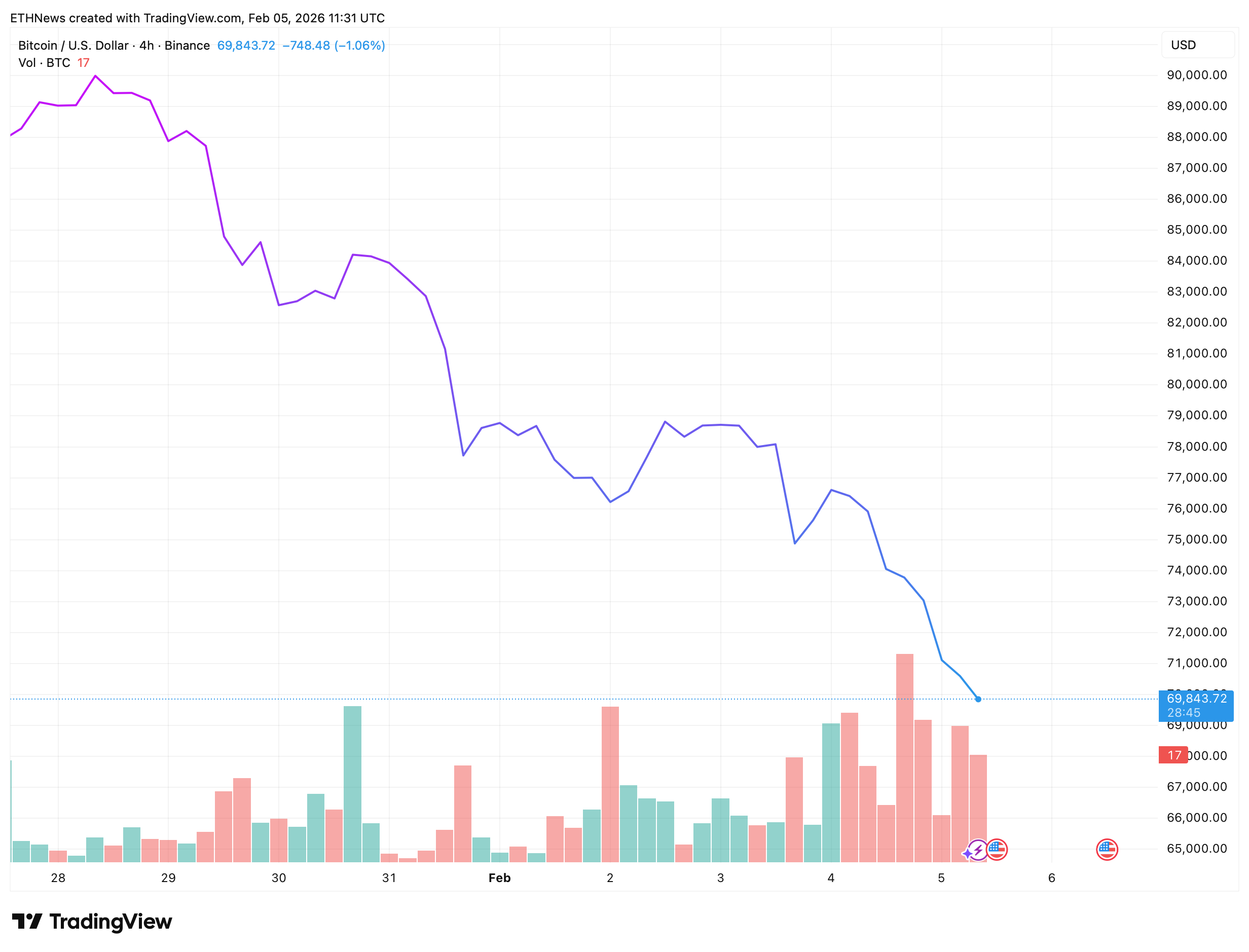Bitcoin extended its corrective move on February 5, falling to $69,900 as selling pressure accelerated across the market.