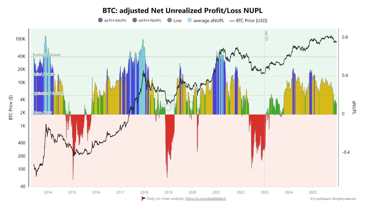From a broader perspective, this behavior aligns with a market that is trending upward while still digesting prior gains. CryptoQuant notes that periodic pullbacks during this phase tend to reset sentiment without forcing aNUPL into negative territory. That dynamic points to sustained holder conviction rather than widespread distribution.