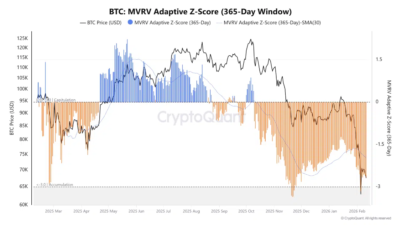 The report highlights the 365-day Adaptive MVRV Z-Score as a key metric for filtering volatility from structural deviation. At the time of analysis, the indicator stands at -2.66, placing Bitcoin firmly within the historical capitulation range.