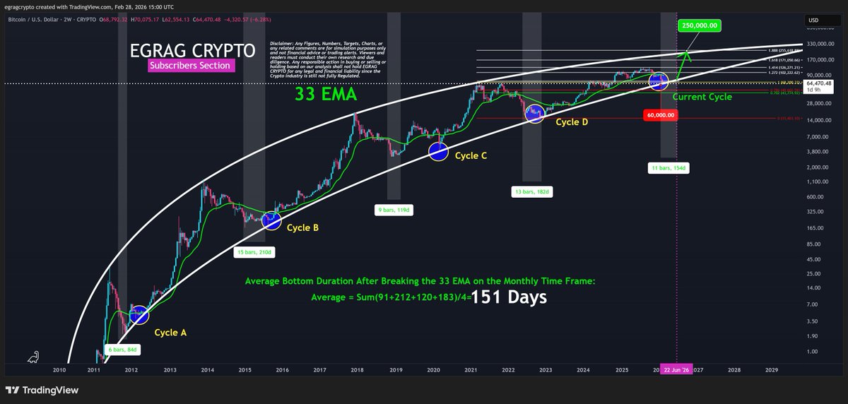 Bitcoin below the 33 EMA, with no deep time reset yet recorded, sits at the earliest and most uncertain phase of that framework. The resolution, whether through patient base-building or an atypical V-shaped recovery, will determine whether the $200,000 to $250,000 target is approached from a position of structural strength or on the back of a pattern deviation that introduces more uncertainty into the timeline.