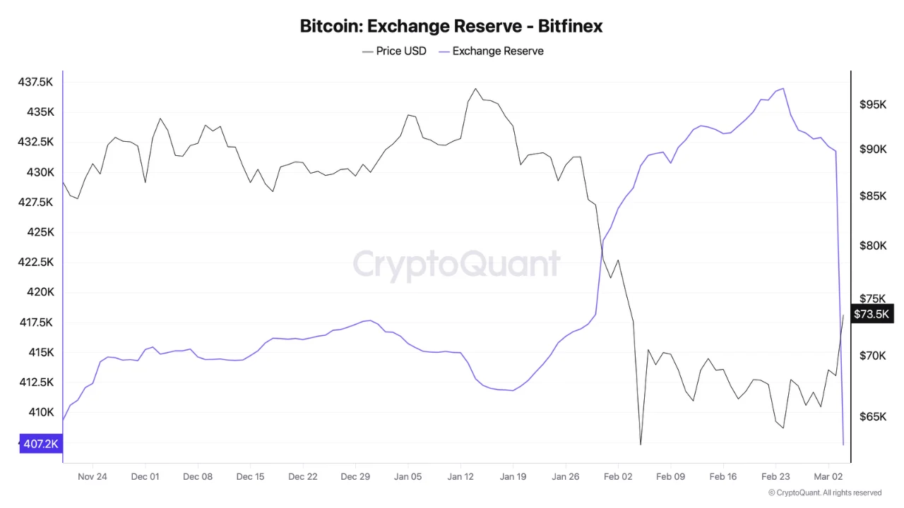 Nearly all of it came from one exchange. Bitfinex’s reserves dropped from 431,767 BTC to 407,140 BTC, an outflow of approximately 24,627 BTC, representing roughly 86% of the total outflow recorded across all exchanges on the day. Remove Bitfinex from the equation and the remaining outflow across every other exchange combined is approximately 4,073 BTC, a routine and unremarkable figure.