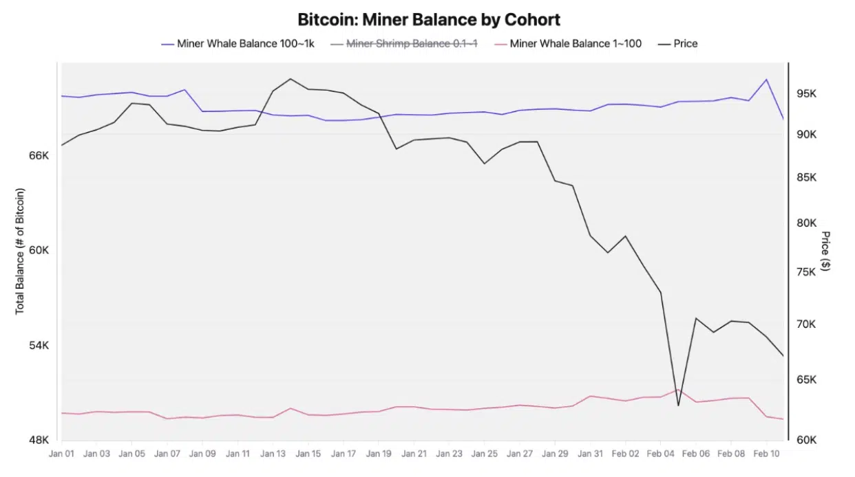 Miner behavior adds another layer of pressure. Large-scale operators began trimming positions after February 9th, contributing incremental supply into a market already lacking broad demand. While miner flows do not dictate price direction independently, sustained distribution during weak participation phases can extend corrective structures.