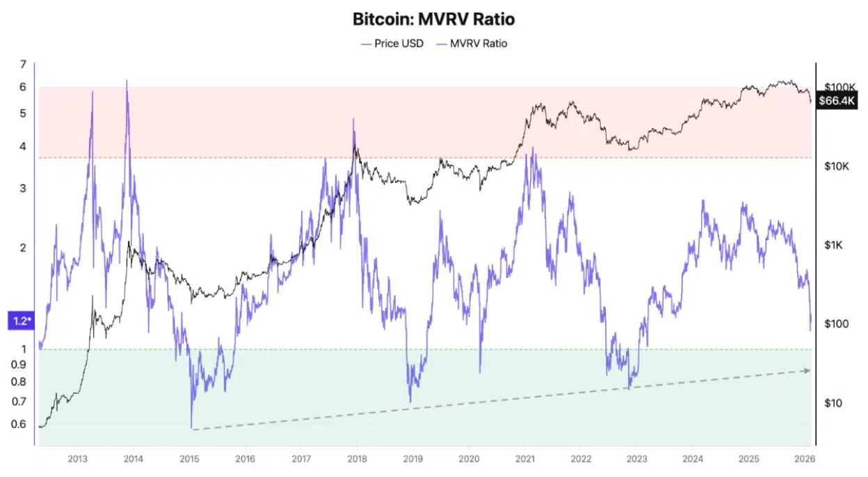 The MVRV ratio currently stands near 1.2. Historically, macro cycle lows have formed closer to the 0.7–0.8 region. If historical compression bands were to repeat proportionally, that framework would imply additional downside potential before valuation reaches long-term accumulation zones.