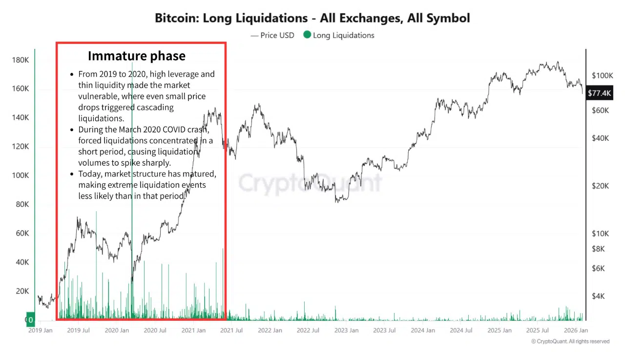 According to a CryptoQuant report, the move was a classic liquidity-driven cascade, where forced liquidations, not discretionary selling, accelerated downside momentum and pushed price below the $79,000 level.