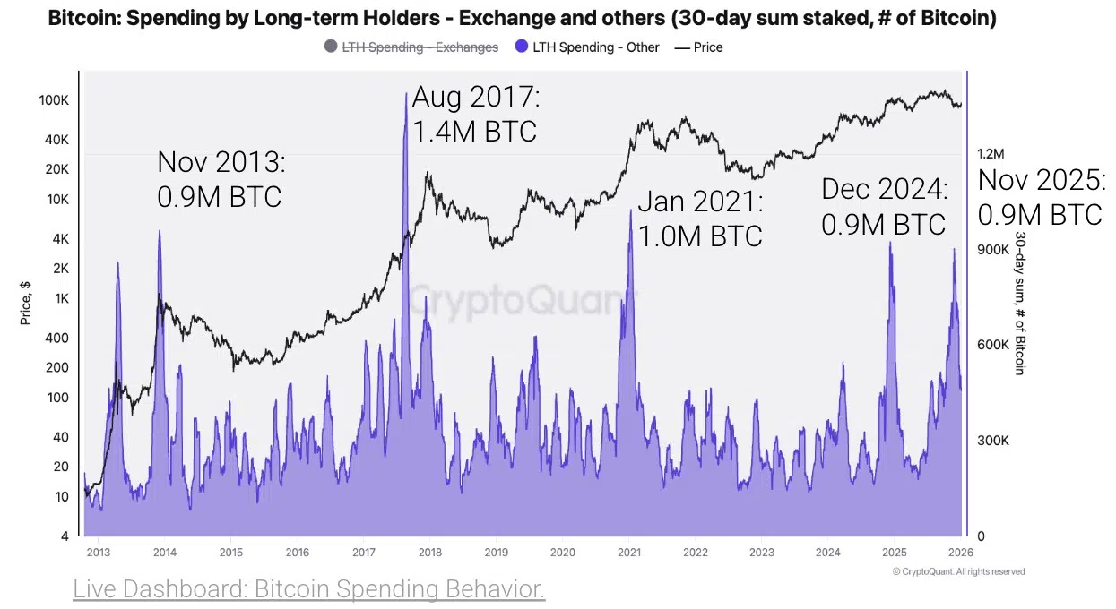 According to CryptoQuant data, Bitcoin long-term holder (LTH) spending has risen sharply, approaching levels historically seen near major market inflection points.