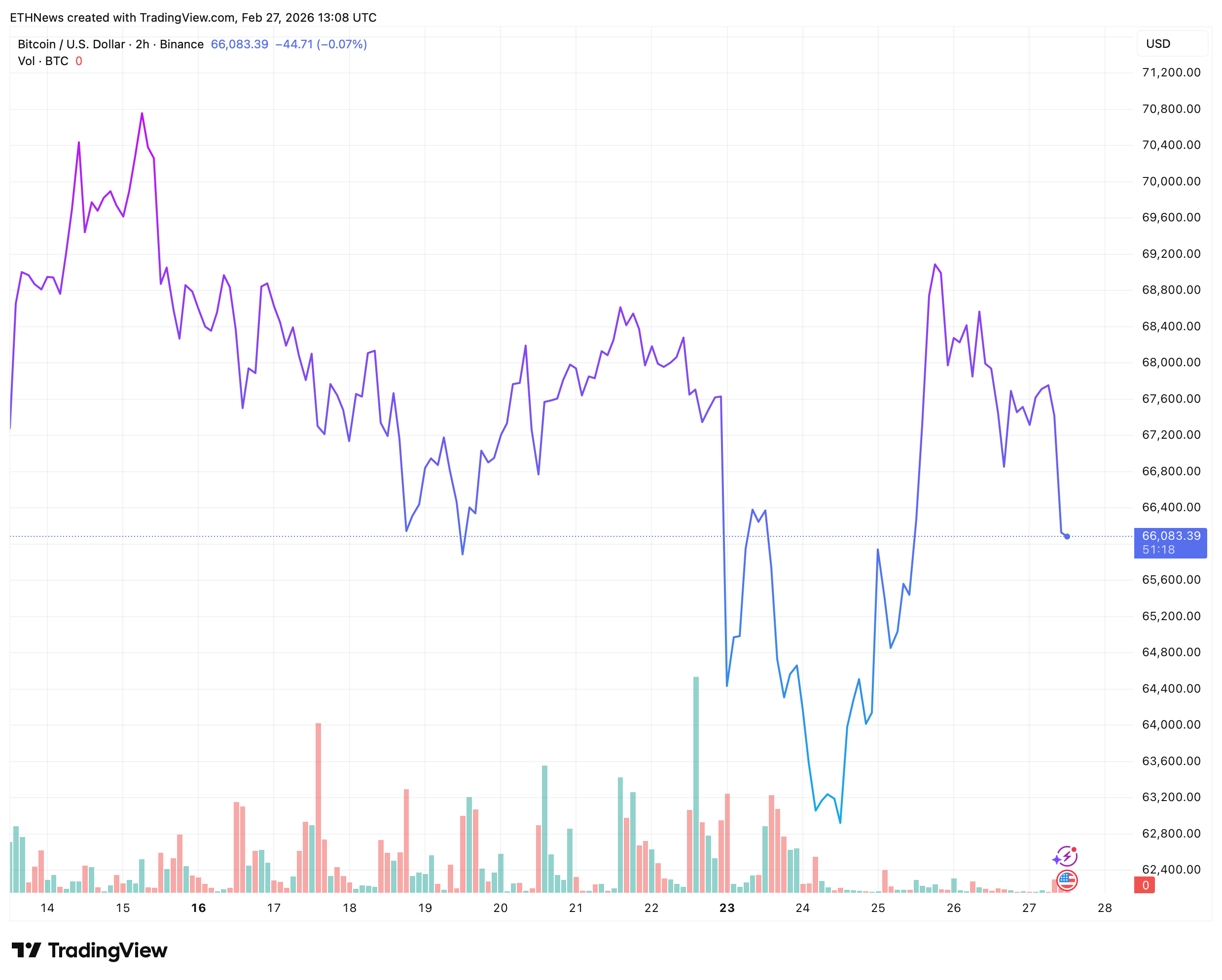 The current price structure highlights a divergence in timeframe interpretation. On the 2-hour chart, Bitcoin is consolidating within a defined range between $63,000 and $69,000. From a trading perspective, this resembles standard range rotation following a volatility event.