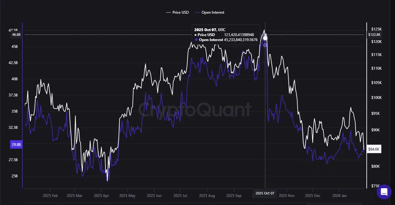 Bitcoin Open Interest (OI), primarily tied to futures markets and representing the total dollar value of open contracts, peaked at approximately $47.5 billion on October 7, 2025, the same day Bitcoin marked its most recent ATH.