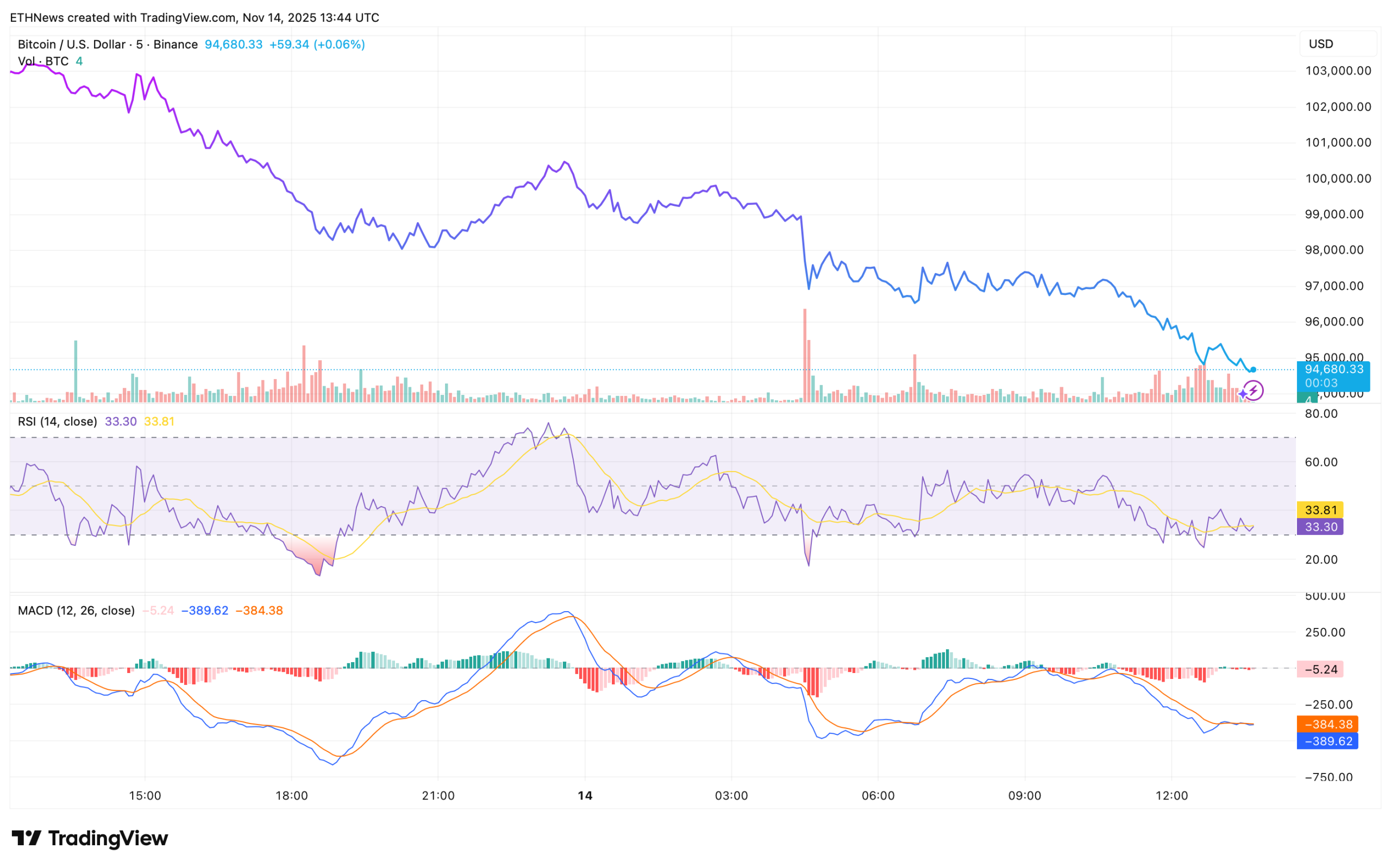 MACD also reflects downward momentum, with the MACD line at -389.62 and the signal line at -384.38, keeping histogram bars in negative territory. The separation between the two lines shows that bearish acceleration has not yet cooled.