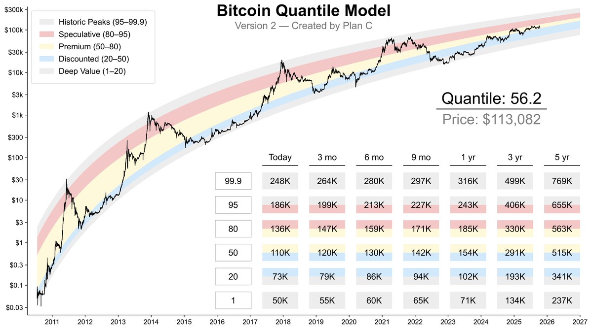 According to PlanC, the model currently places Bitcoin at a quantile level of 56.2, corresponding to a price of around $113,000. Over the next year, the framework suggests possible trading ranges between $154,000 (median zone) and $316,000 (historic peak zone), with extended projections showing potential valuations as high as $769,000 by 2027 under the most optimistic quantile conditions.