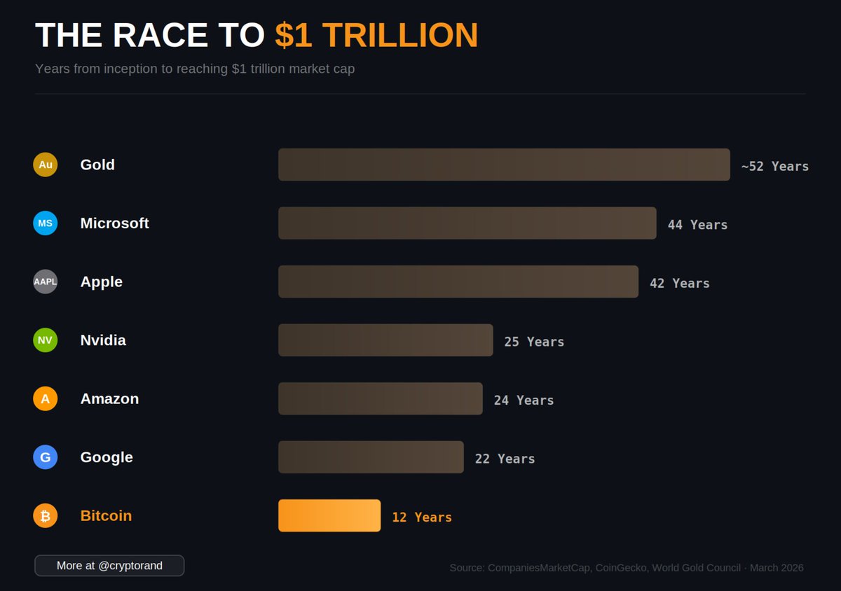 The Race to $1 Trillion chart published by Rand Group, sourced from CompaniesMarketCap, CoinGecko, and the World Gold Council as of March 2026, measures the years from inception to reaching a $1 trillion market capitalization for seven assets.