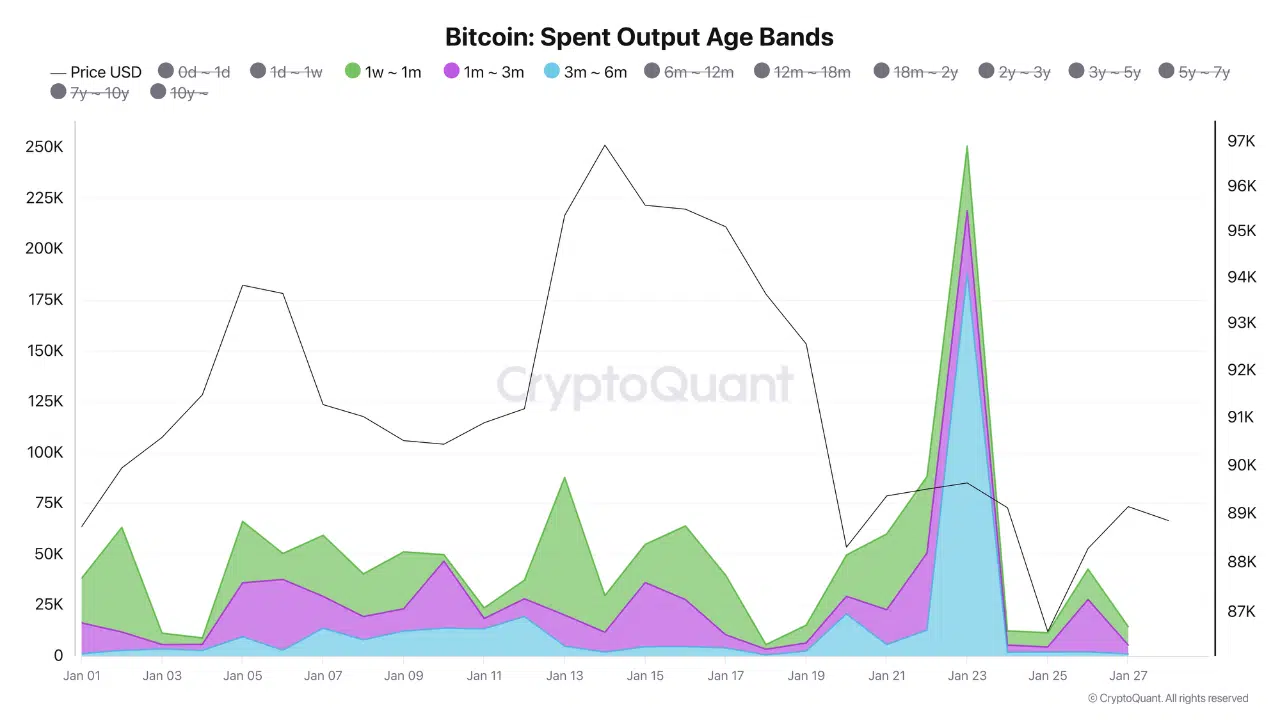 All BTC in the 3m–6m cohort were likely acquired during the October 10 drawdown, at prices between $102,000 and $126,000. When these UTXOs were destroyed and recreated through consolidation, they were recorded as realized losses because Bitcoin was trading significantly lower on January 23.