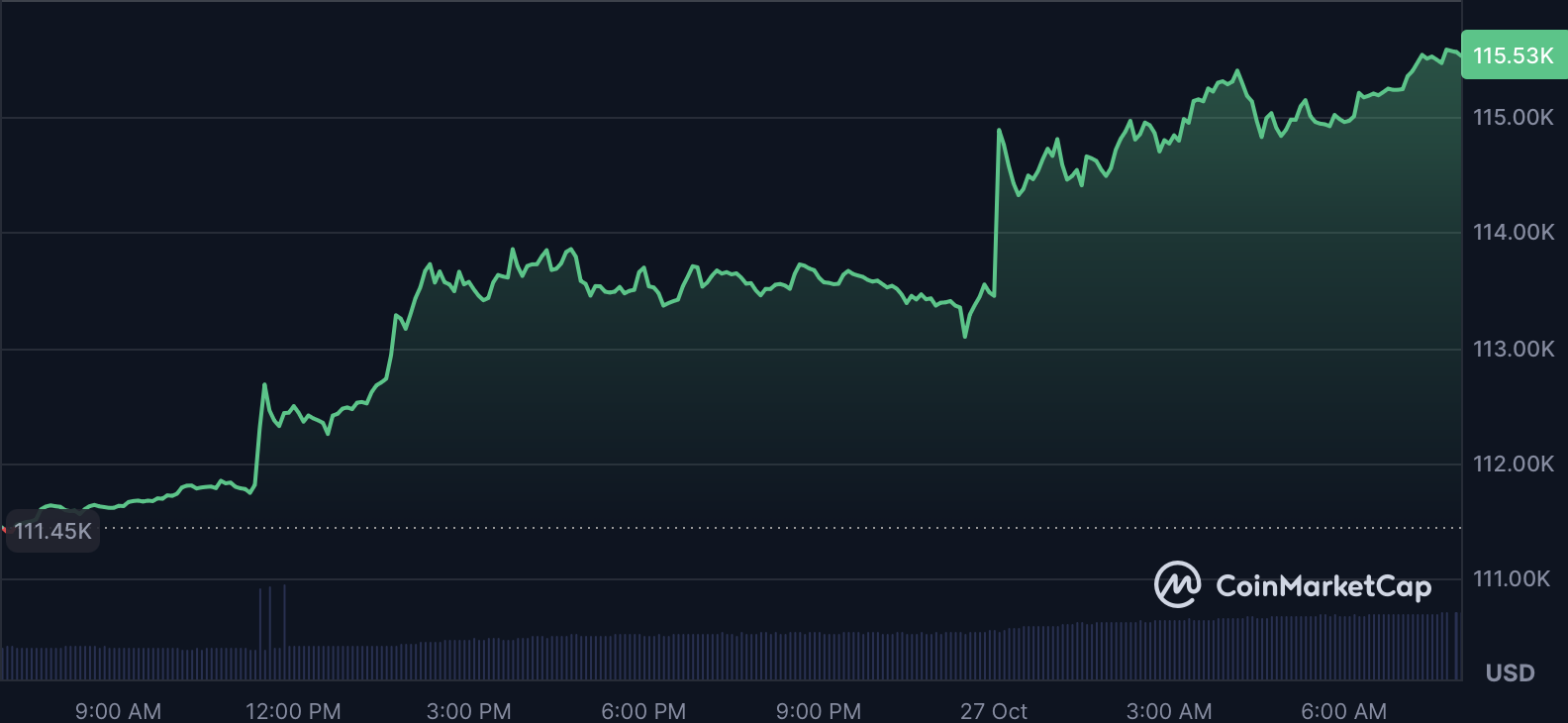 Bitcoin surged past $115,000, gaining 3.5% in the past 24 hours, as global markets rallied on renewed macro optimism and strong institutional inflows. According to data from CoinMarketCap, Bitcoin’s market cap has reached $2.3 trillion, supported by a 106% jump in 24-hour trading volume to over $49 billion.