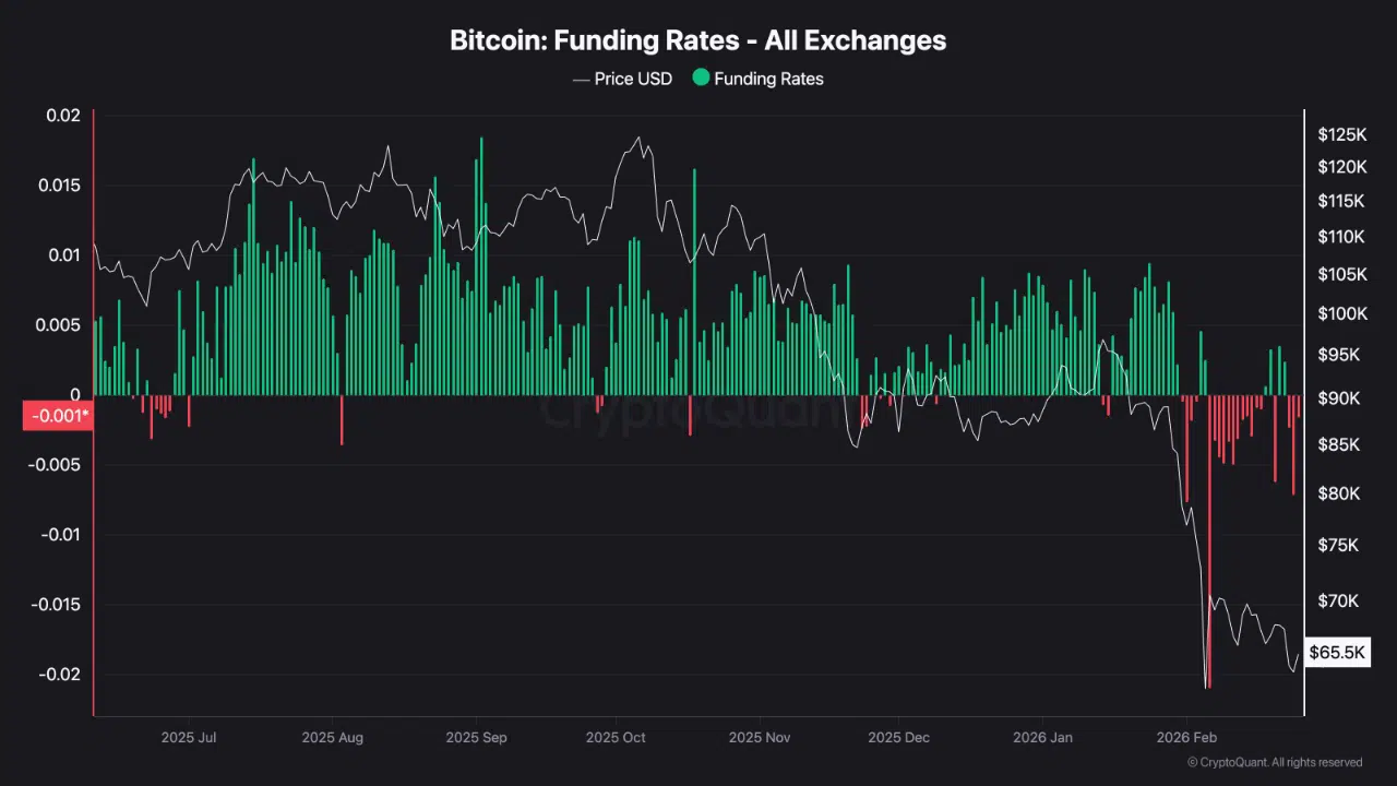 According to derivatives data compiled by CryptoQuant, Bitcoin funding rates across major exchanges have recently flipped negative following the latest sell-off.