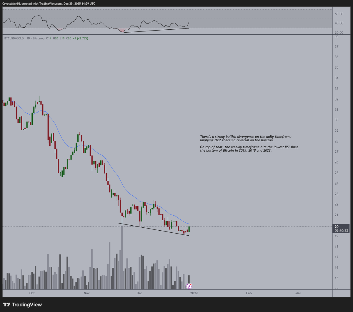 This divergence suggests selling pressure is fading on the Bitcoin side, even as gold remains under pressure. According to van de Poppe, this type of behavior often marks the early phase of a relative trend reversal rather than a short-lived bounce.