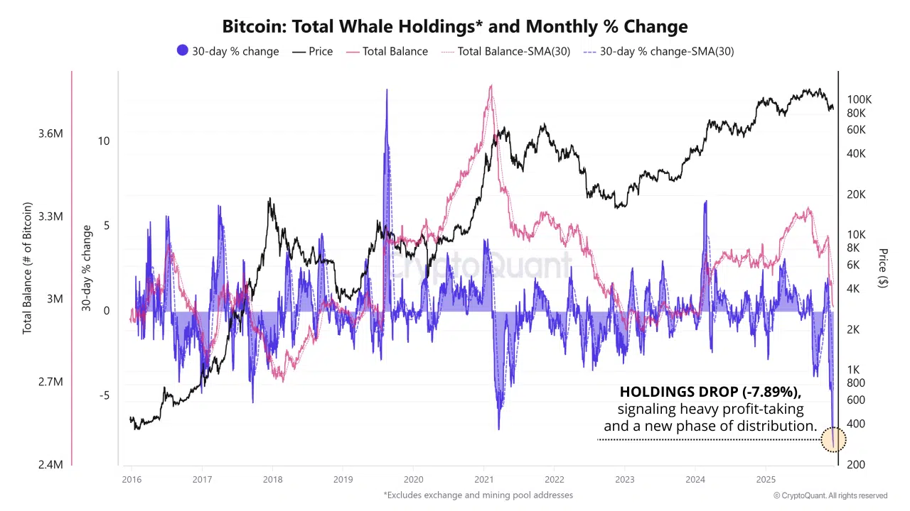 This behavior is also reflected in Bitcoin Total Whale Holdings, which have declined by 7.89%, signaling heavy profit realization and preparation for a broader distribution phase.